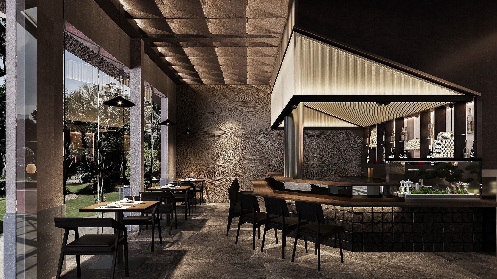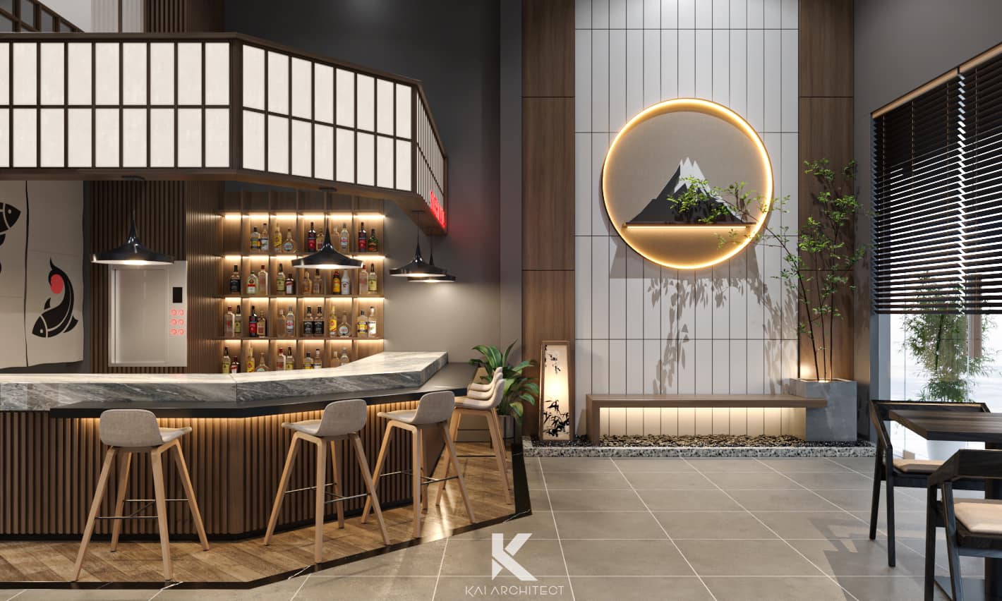 Quầy sushi bar: Đây là khu vực nổi bật nhất của nhà hàng, nơi thực khách có thể ngồi và thưởng thức những món sushi được chế biến ngay trước mắt bởi các đầu bếp tài năng. Quầy sushi bar không chỉ mang lại trải nghiệm ẩm thực sống động mà còn giúp thực khách hiểu hơn về quy trình chế biến sushi.